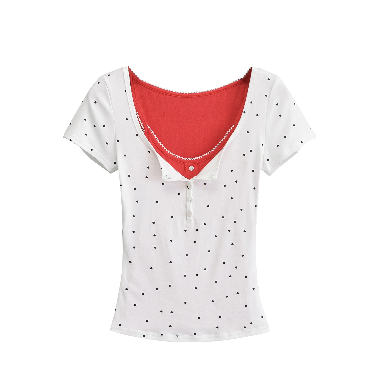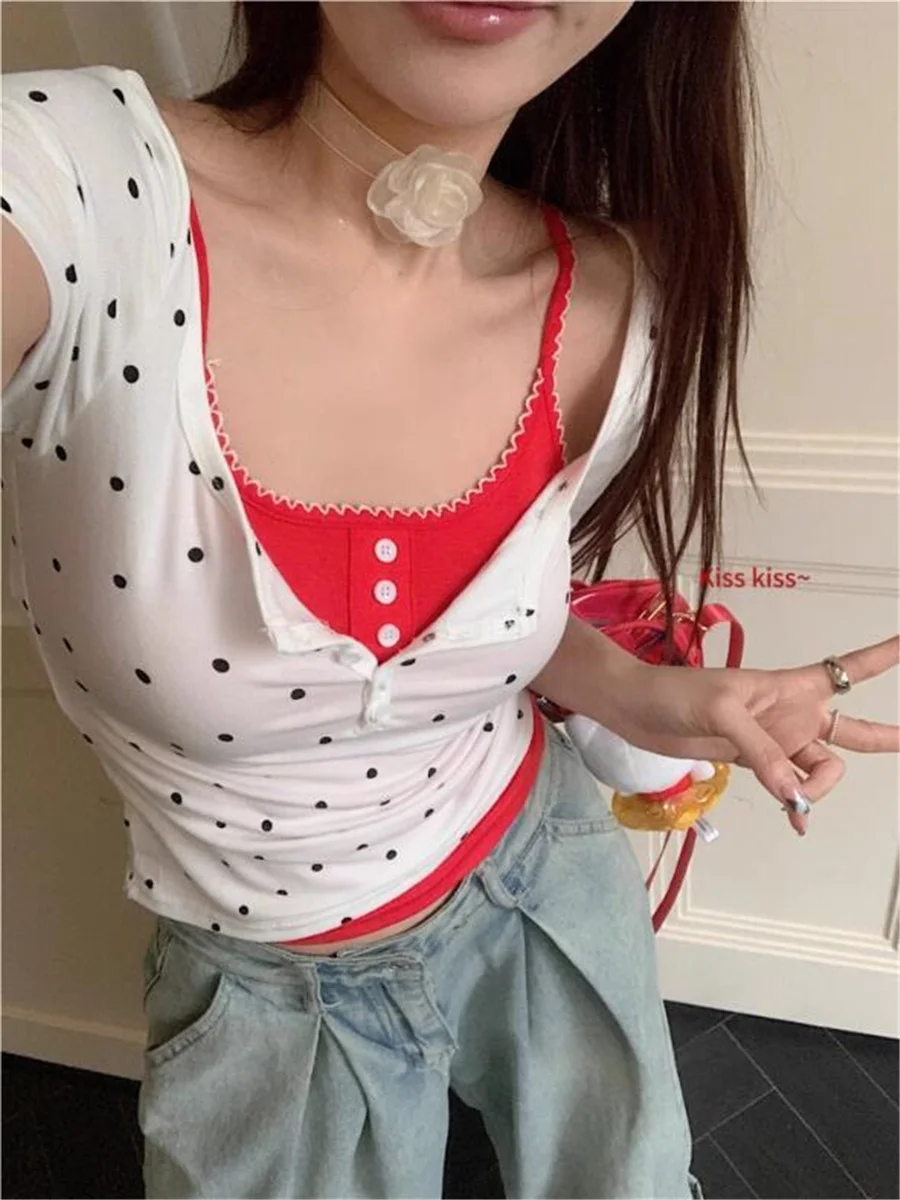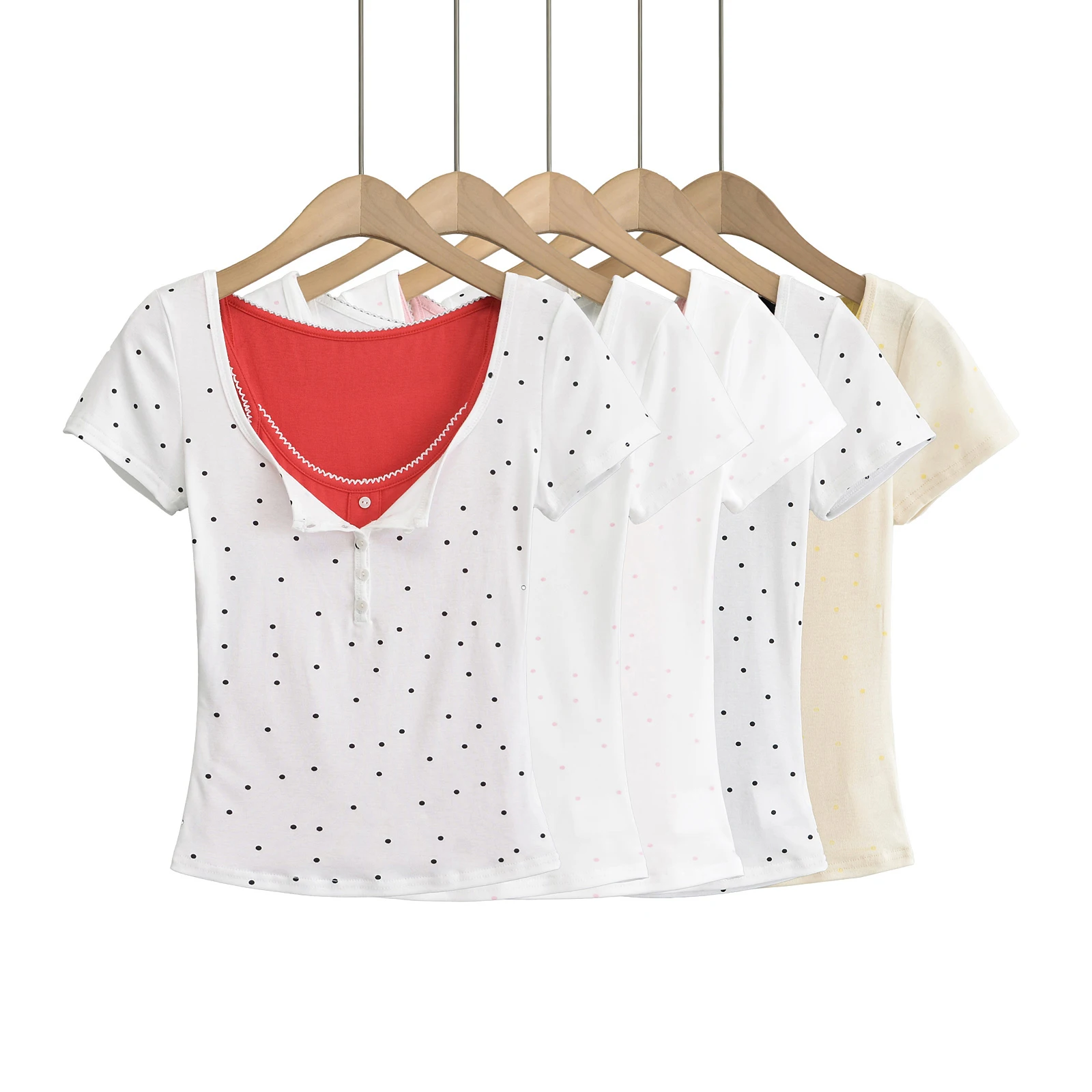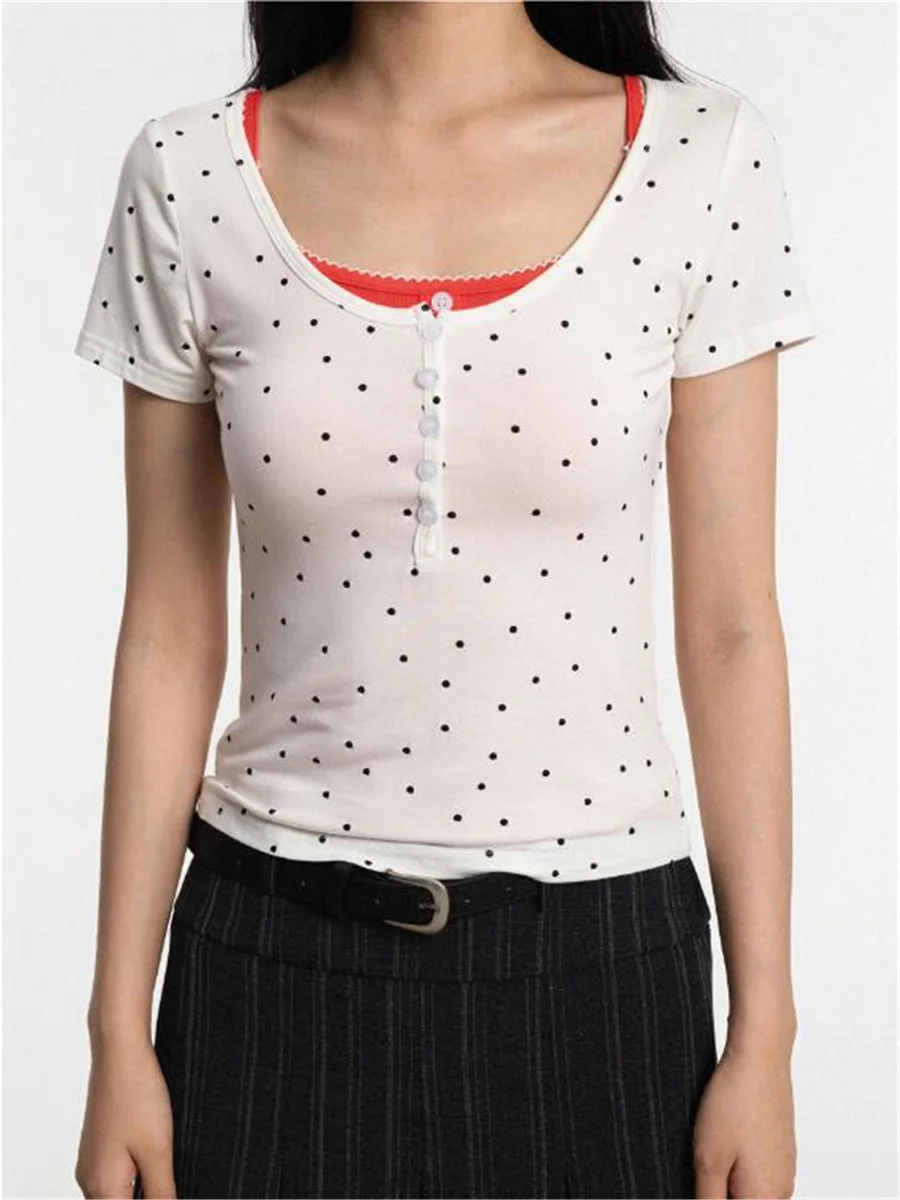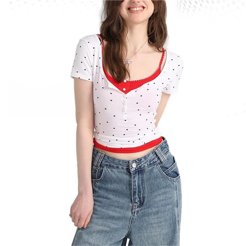 2024 Summer Outfit Polka Dots Print Crop Top Sexy Korean Fashion Short Sleeve Tees Cute Button Up Tees Round Neck T Shirts Slim