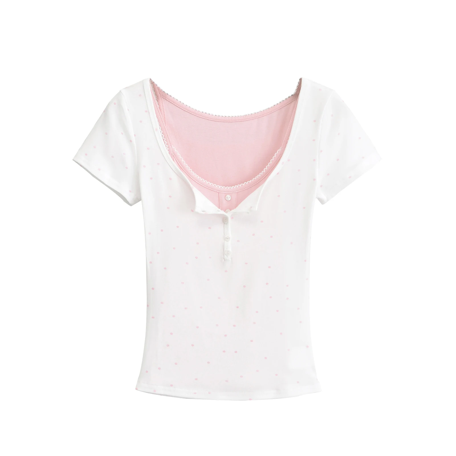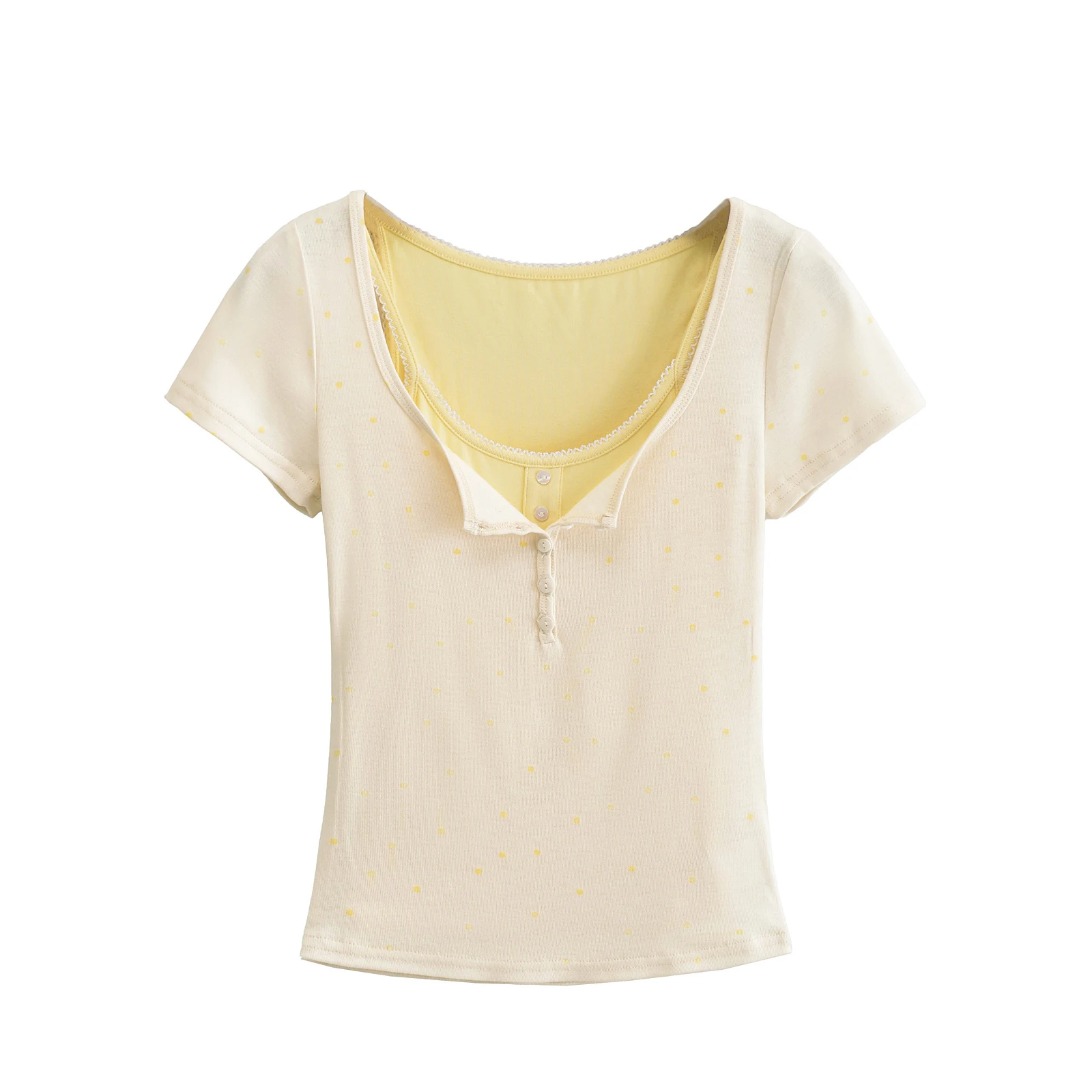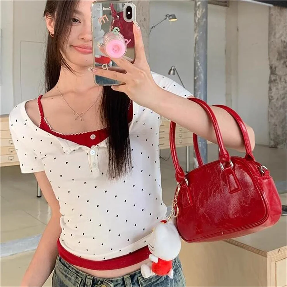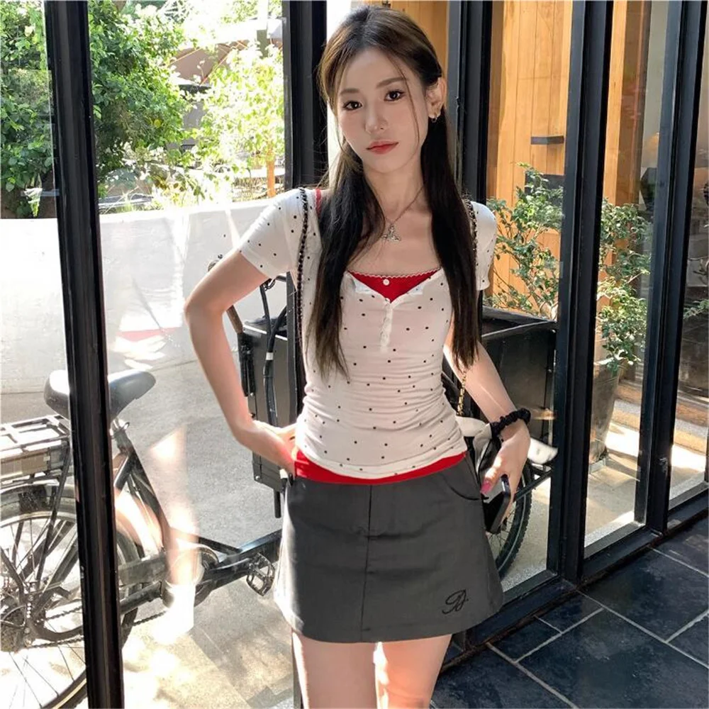 2024 Summer Outfit Polka Dots Print Crop Top Sexy Korean Fashion Short Sleeve Tees Cute Button Up Tees Round Neck T Shirts Slim