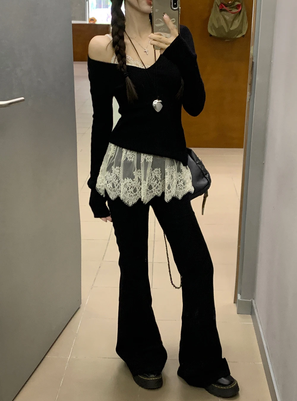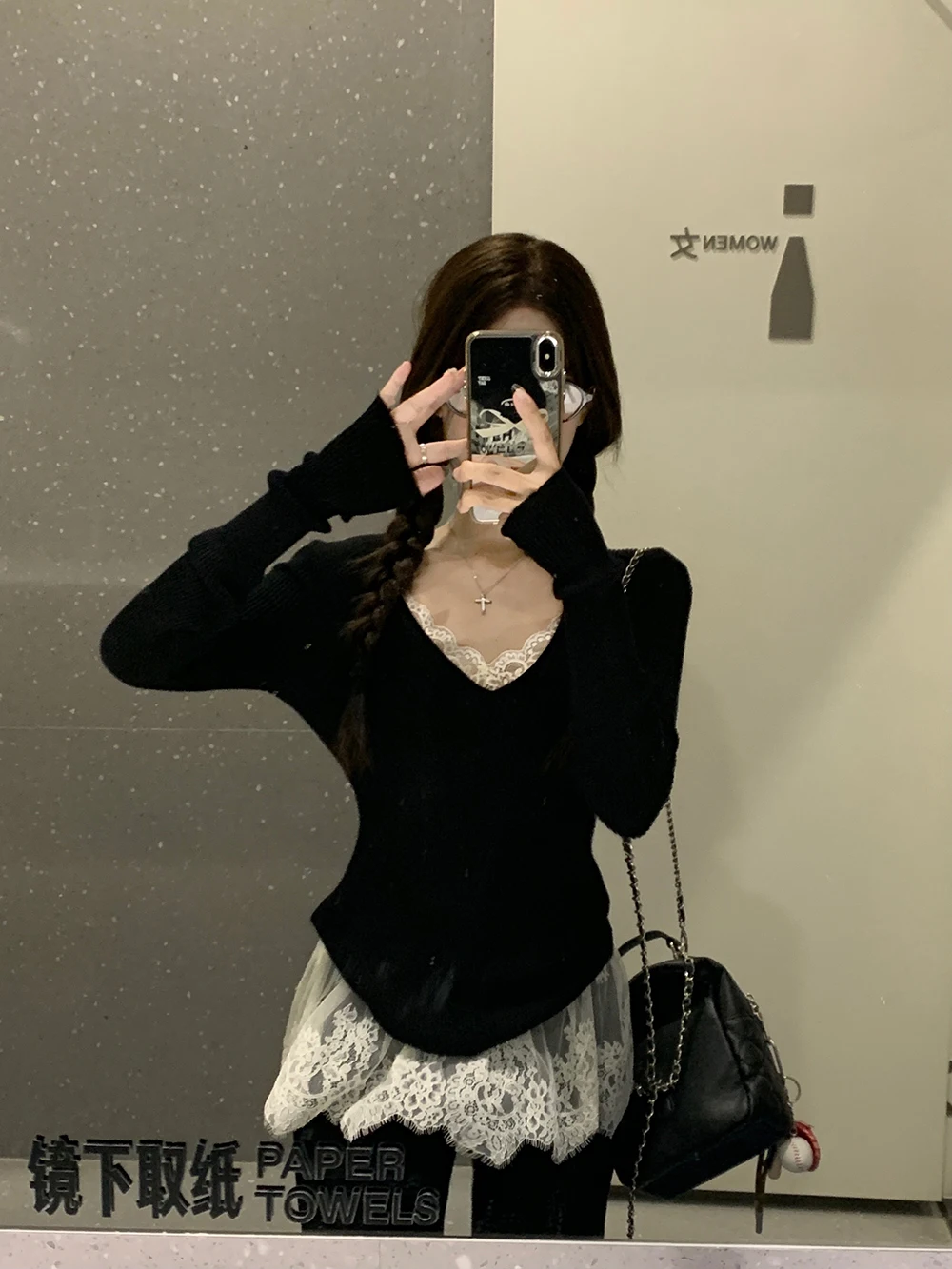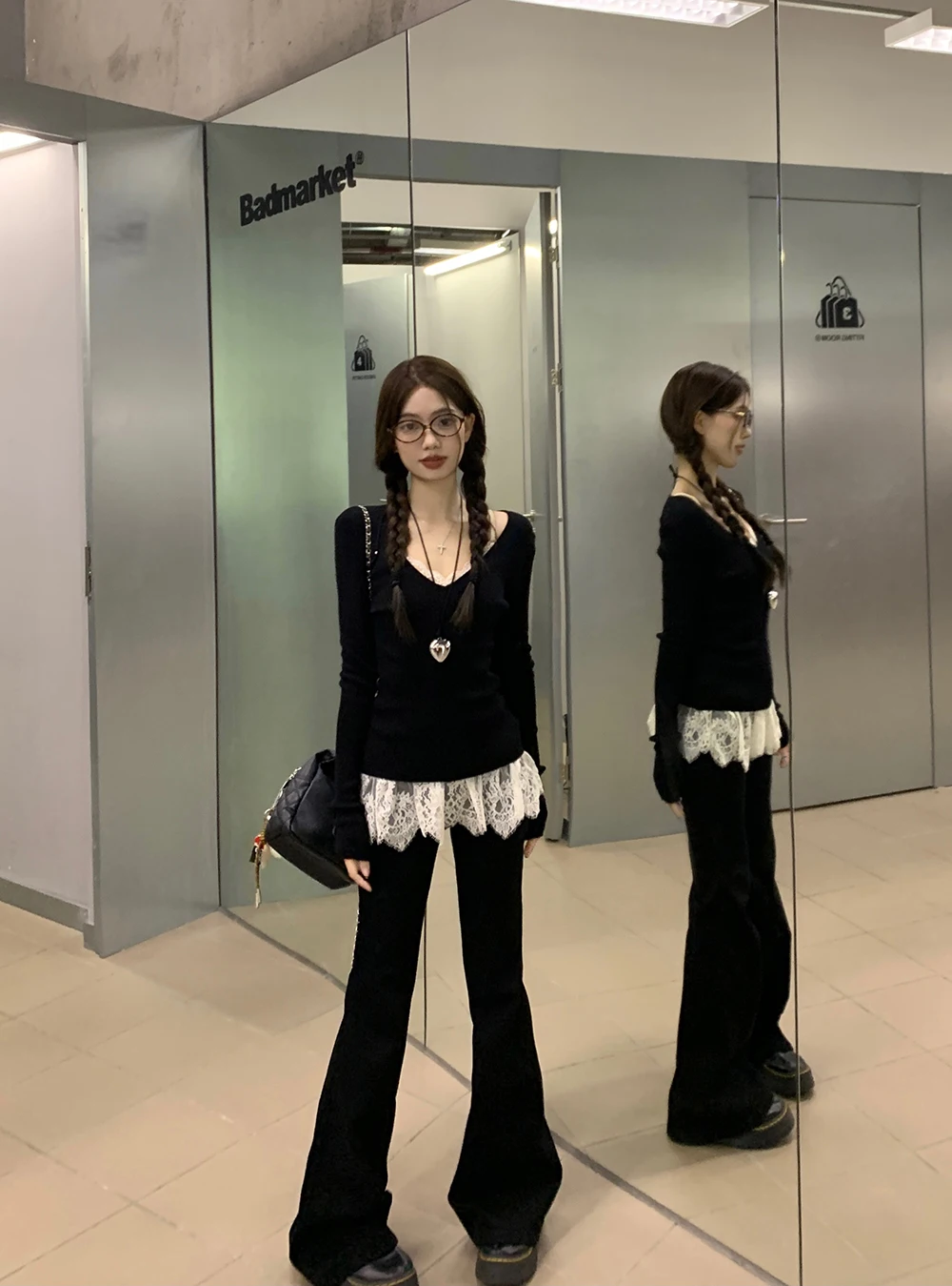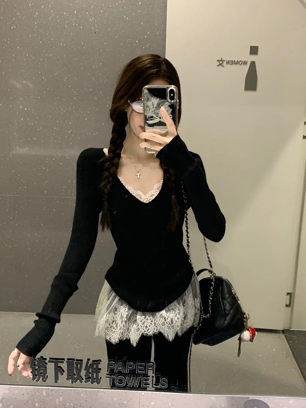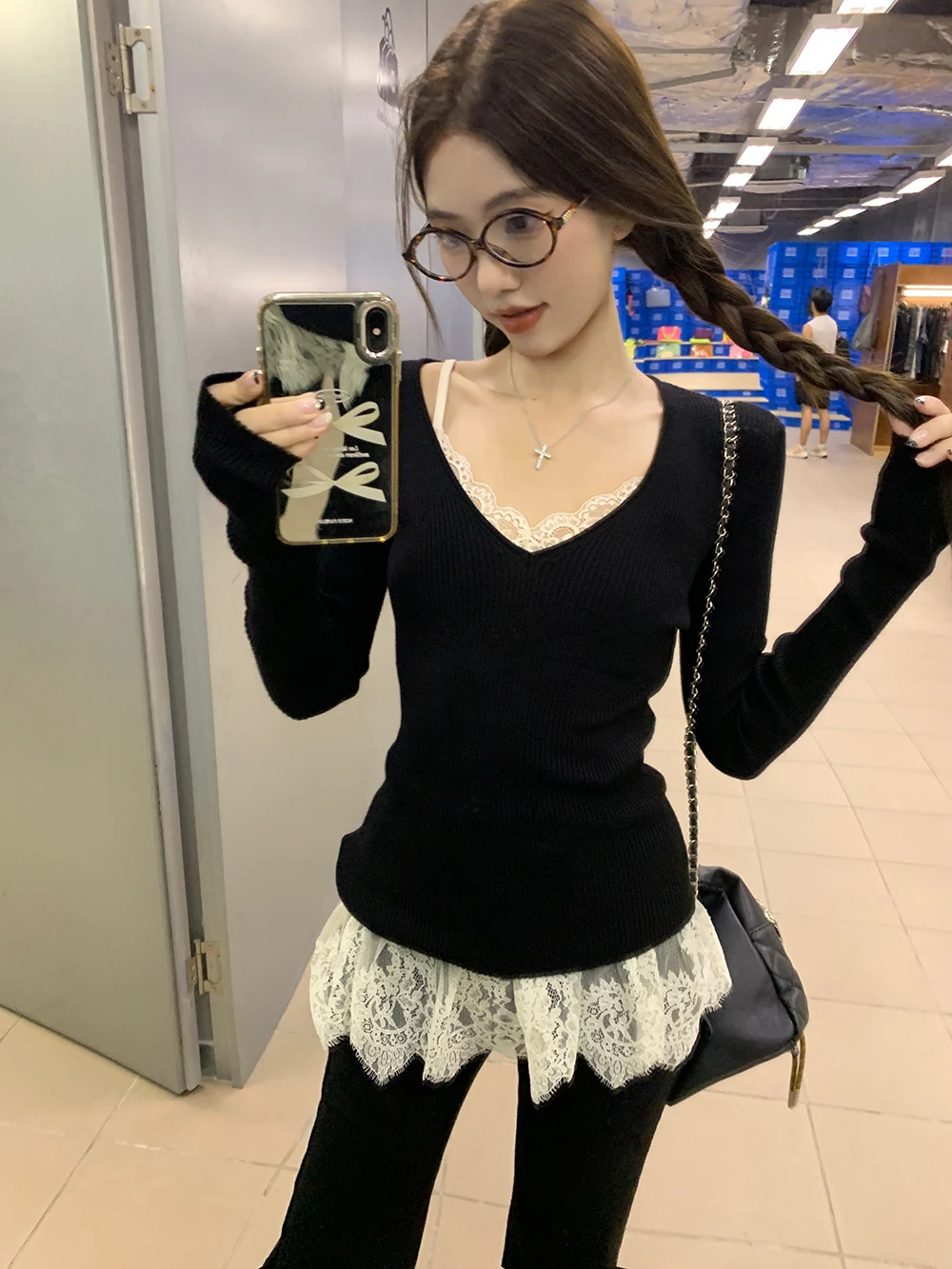 Korobov Autumn Temperament Slim V-neck Black Knitting Top Women's Clothing Lace Vest Sweet Two-piece Set Korean Fashion Suit