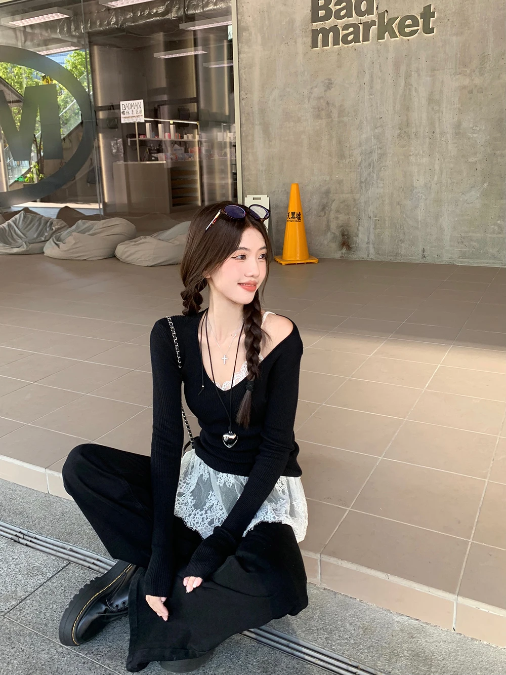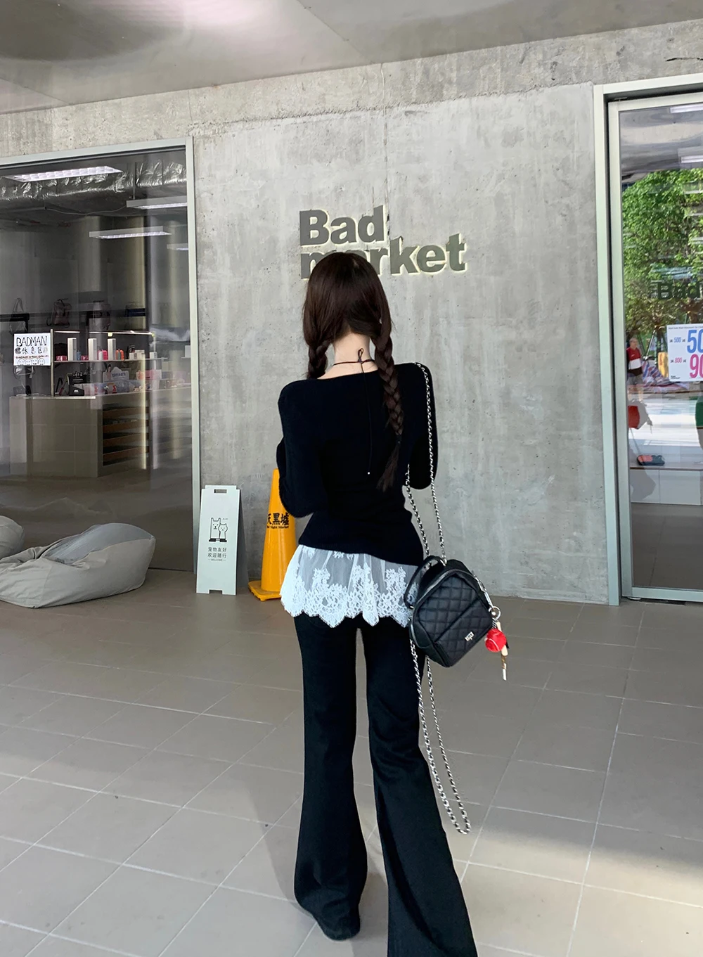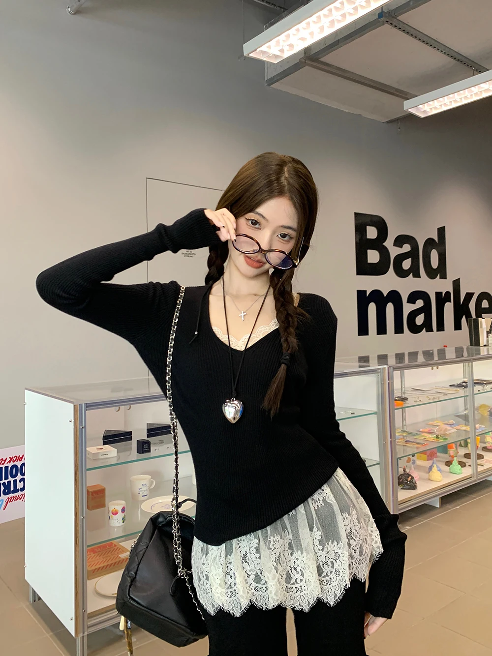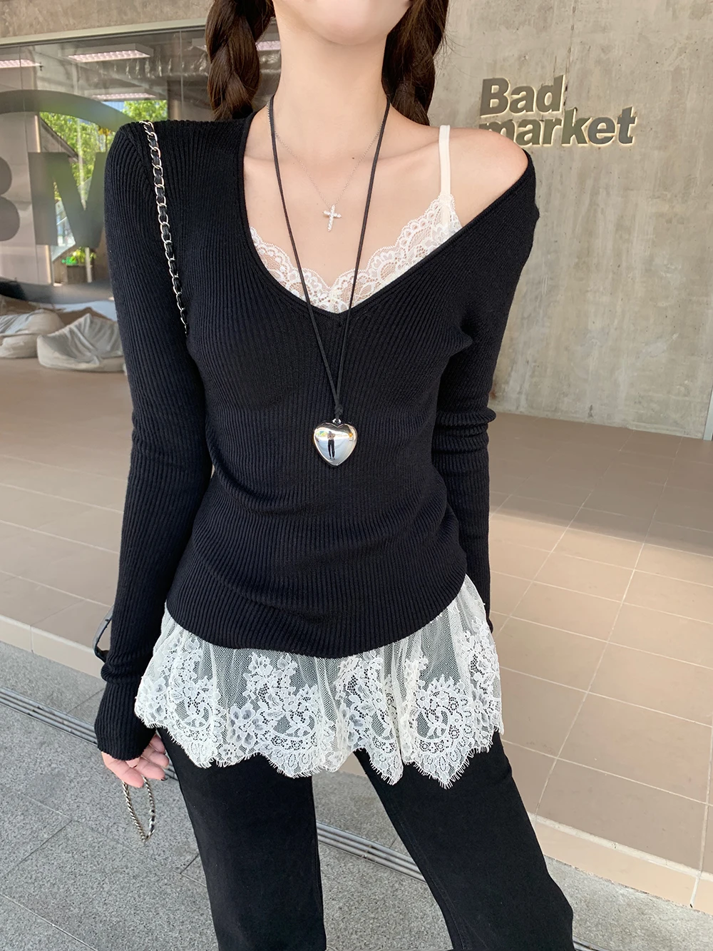Korobov Autumn Temperament Slim V-neck Black Knitting Top Women's Clothing Lace Vest Sweet Two-piece Set Korean Fashion Suit
