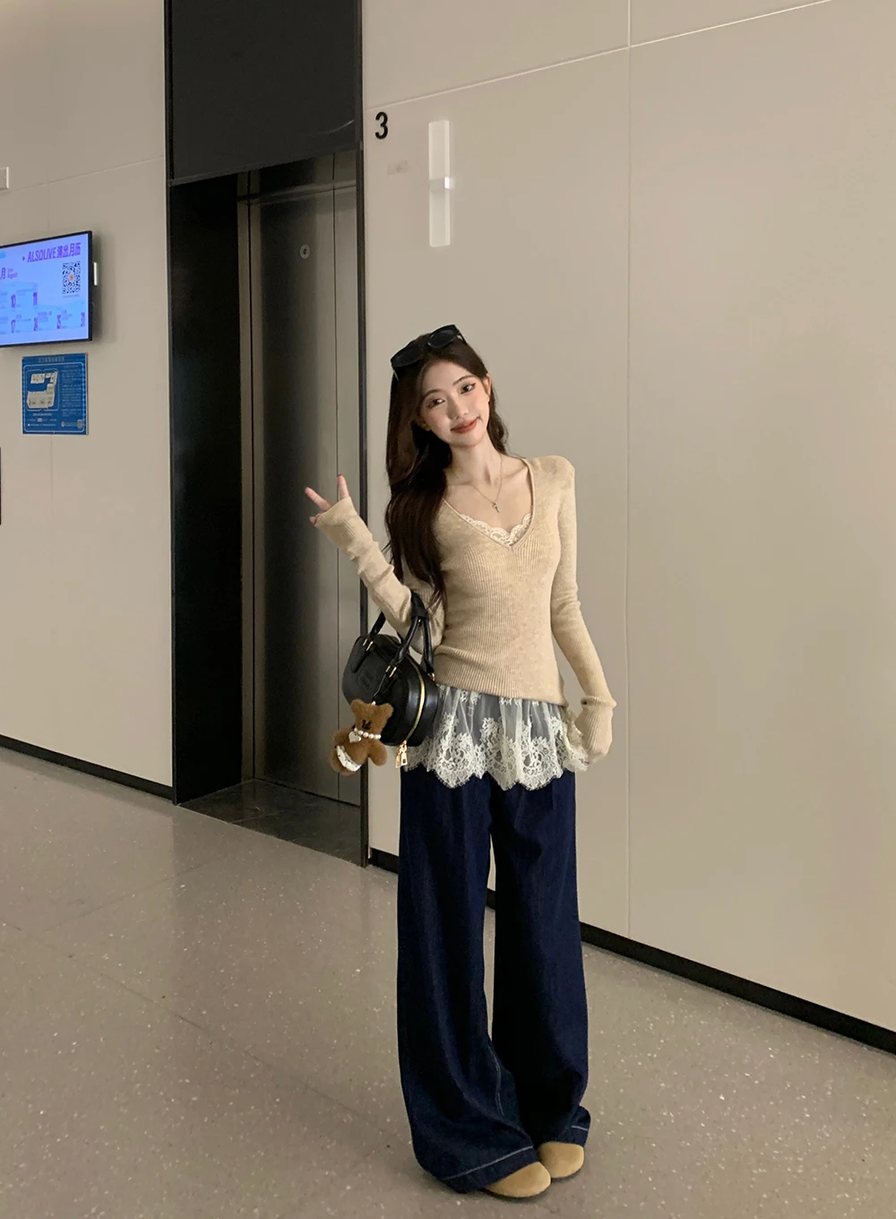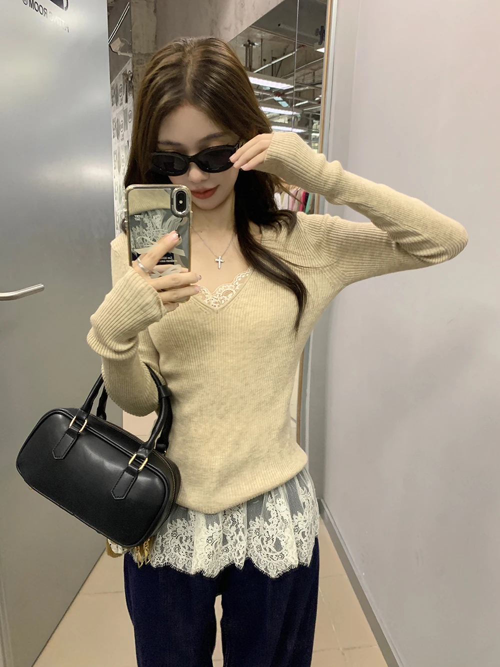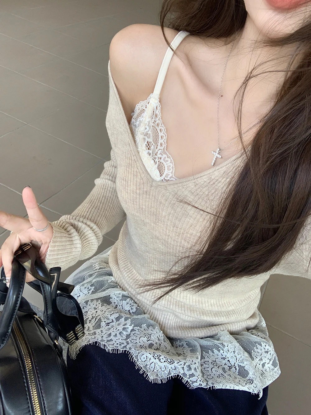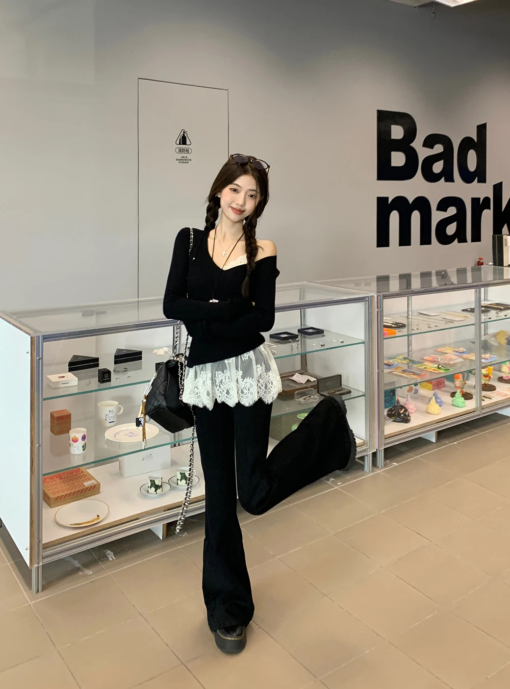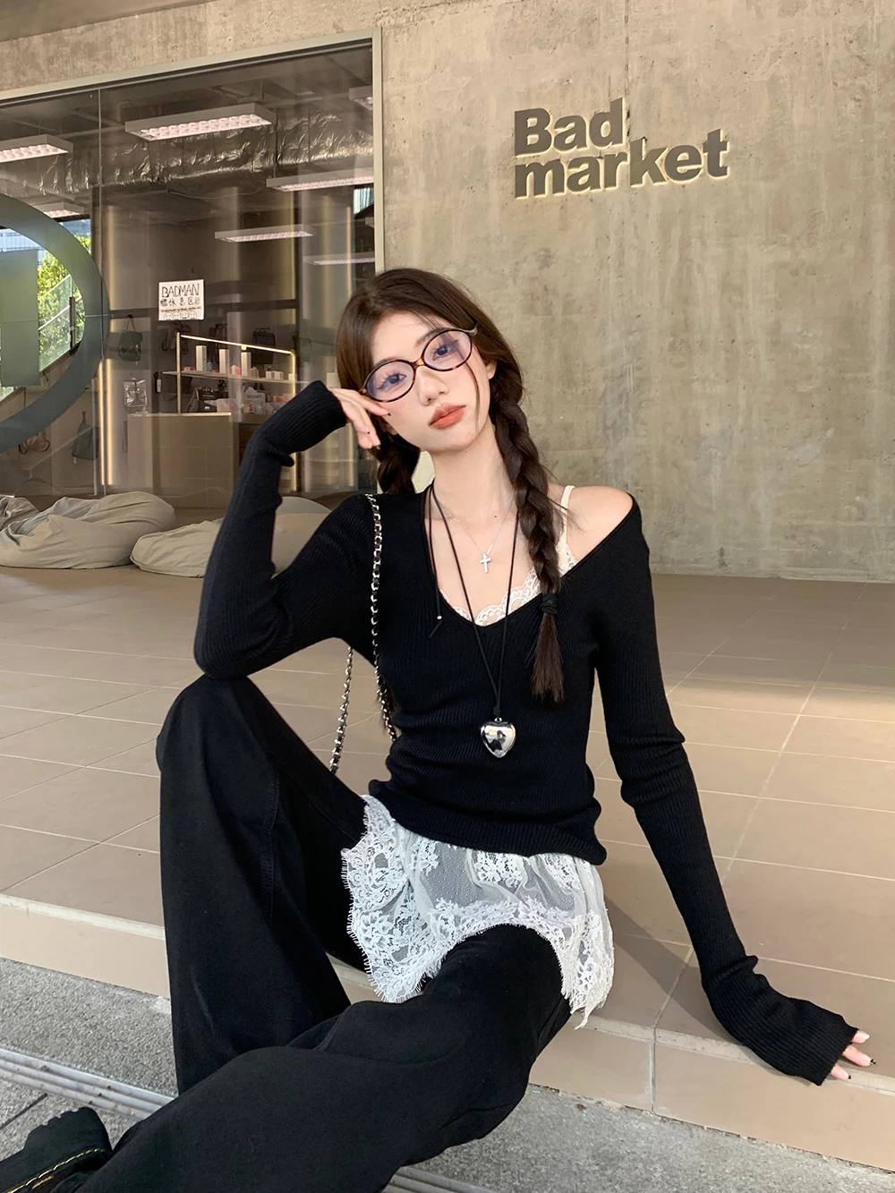 Korobov Autumn Temperament Slim V-neck Black Knitting Top Women's Clothing Lace Vest Sweet Two-piece Set Korean Fashion Suit