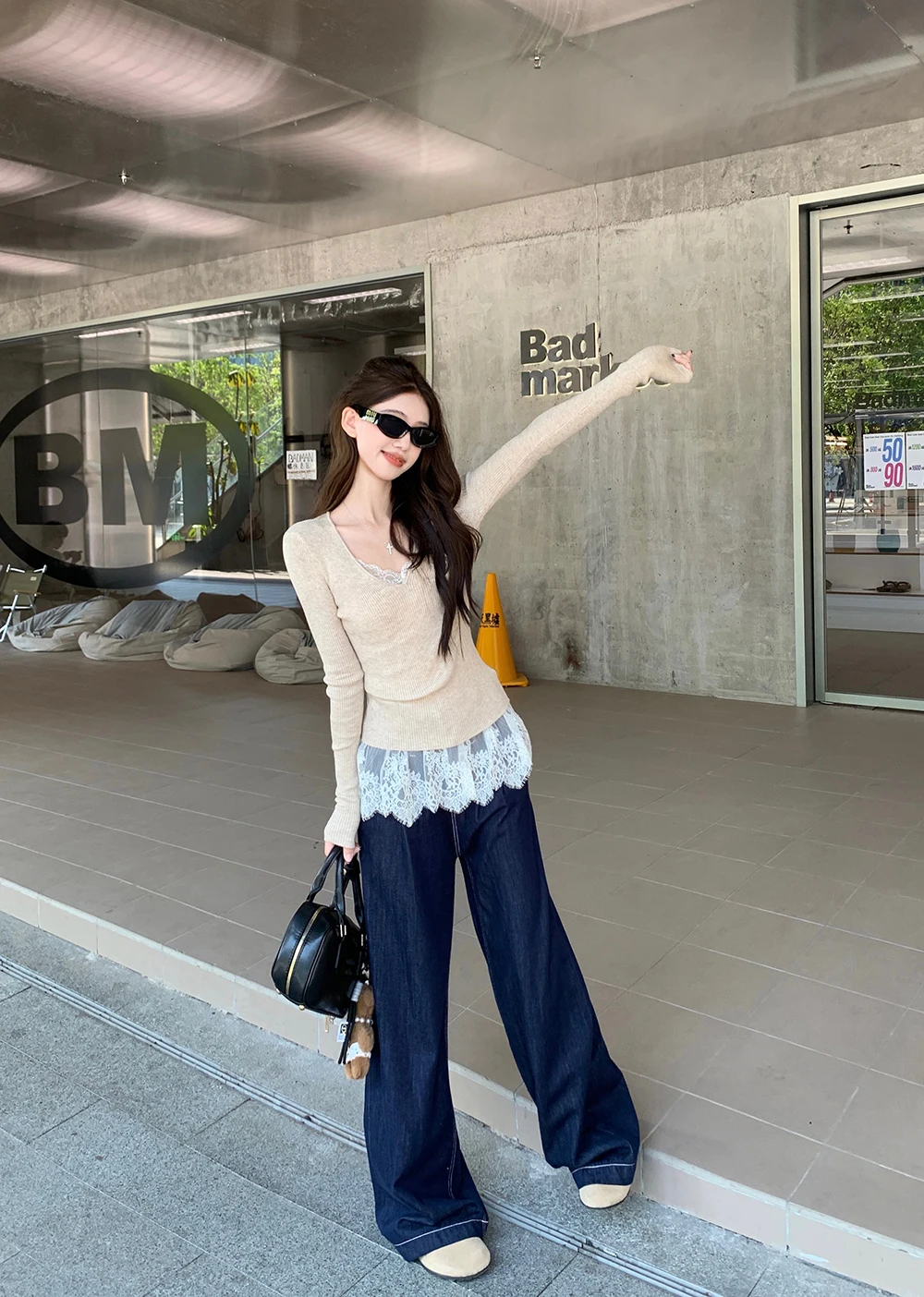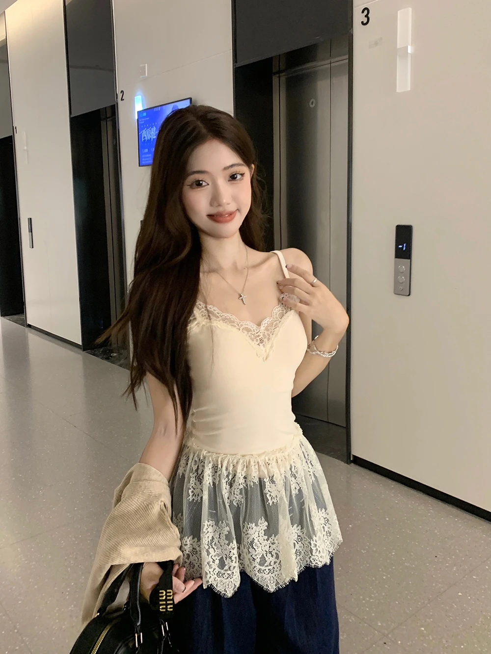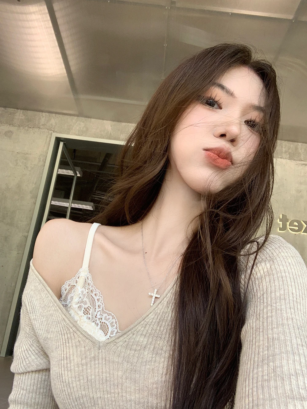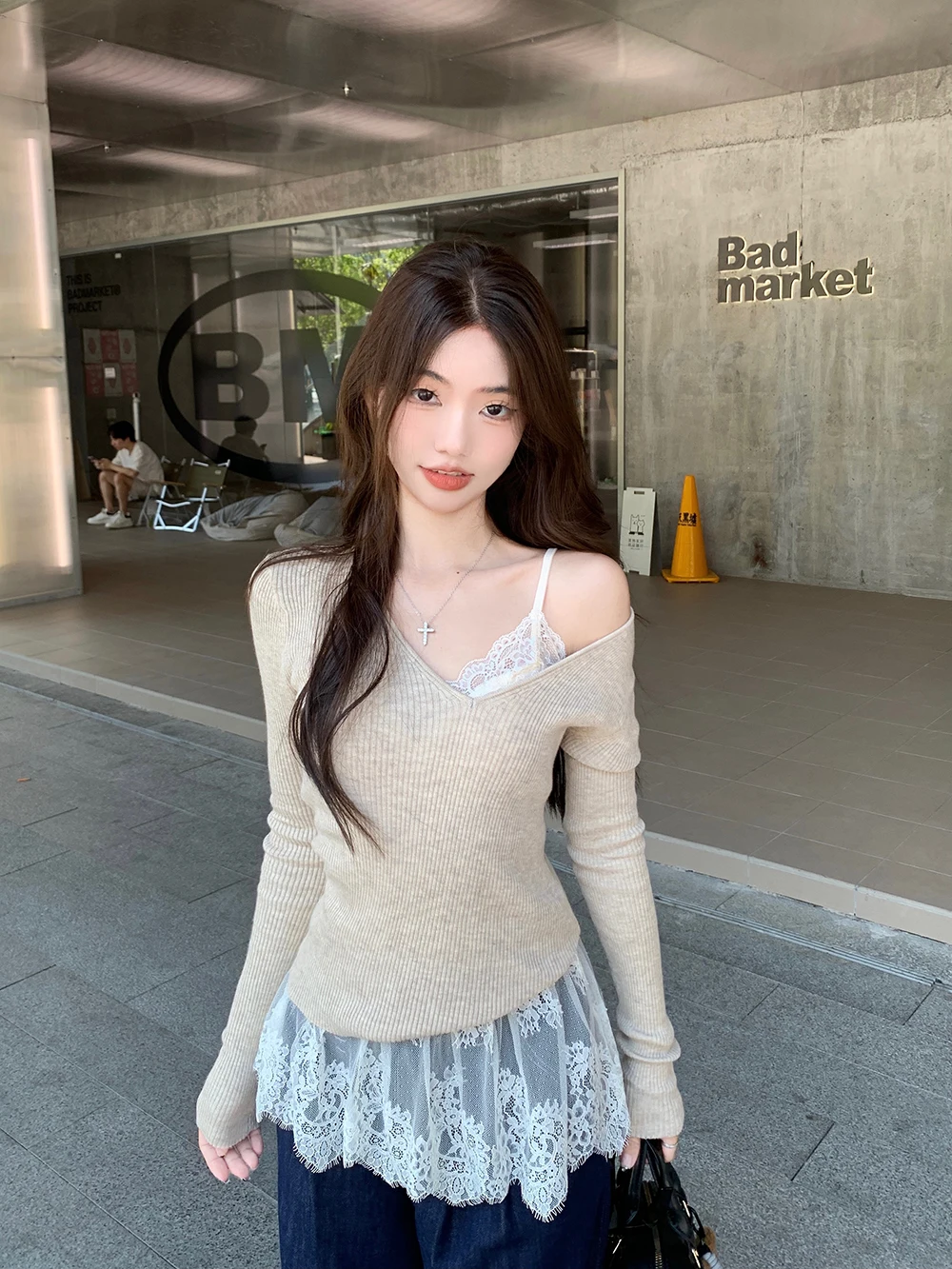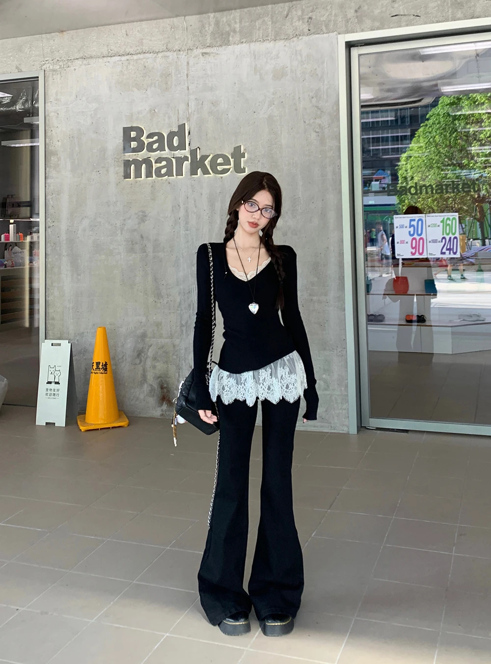 Korobov Autumn Temperament Slim V-neck Black Knitting Top Women's Clothing Lace Vest Sweet Two-piece Set Korean Fashion Suit