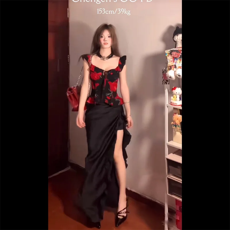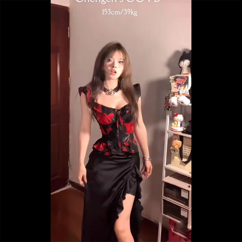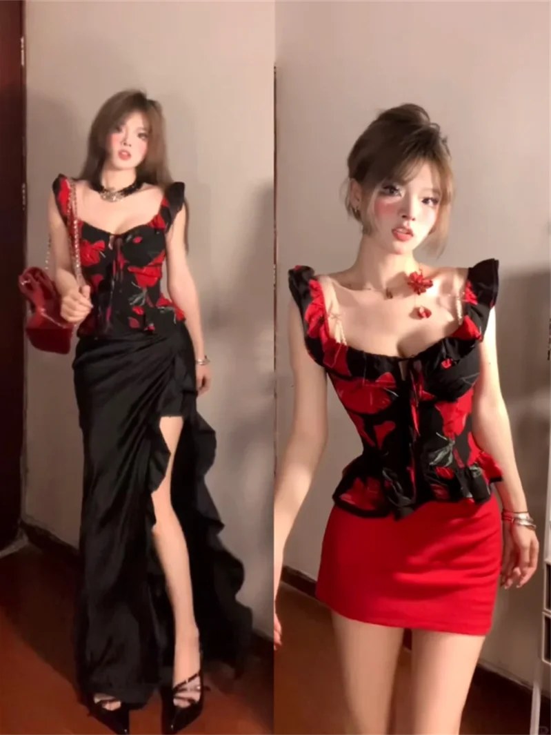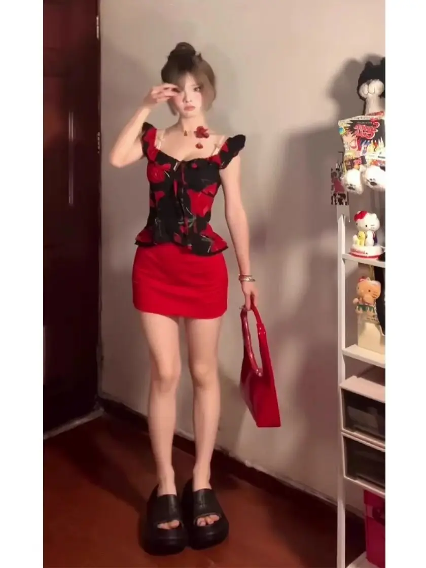 Woman 2000s Korean Fashion 2 Piece Skiet Set Beach Casual Red Crop Tops + Floral Slim Y2k Mini Skirt Hot Girls Sweet Suit 2024