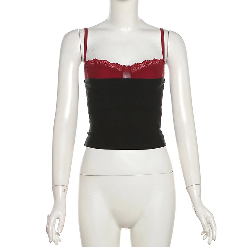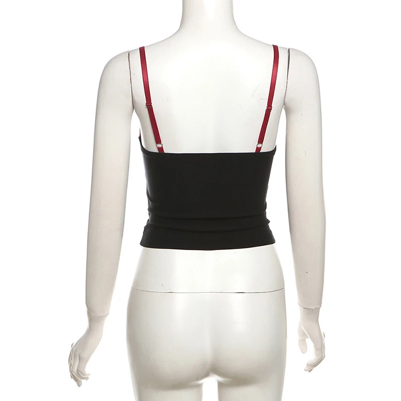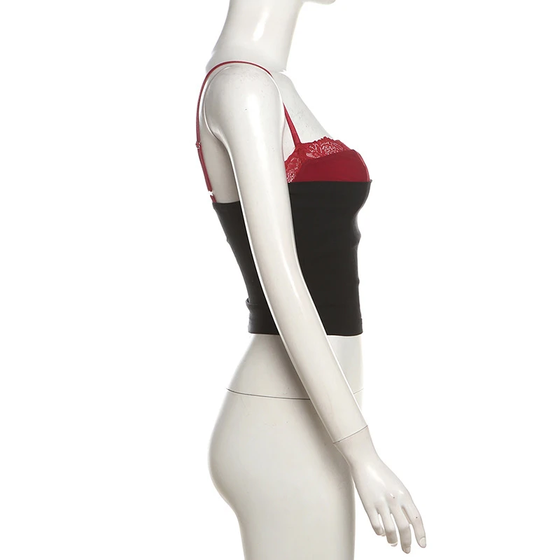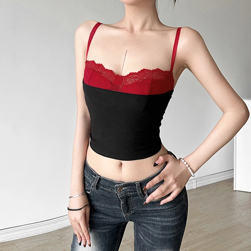 Women's Crop Camisole Slim Contrast Fake Two-Piece Sweetheart Neck Showing Navel Spaghetti Strap Tops for Summer Y2K Clothes
